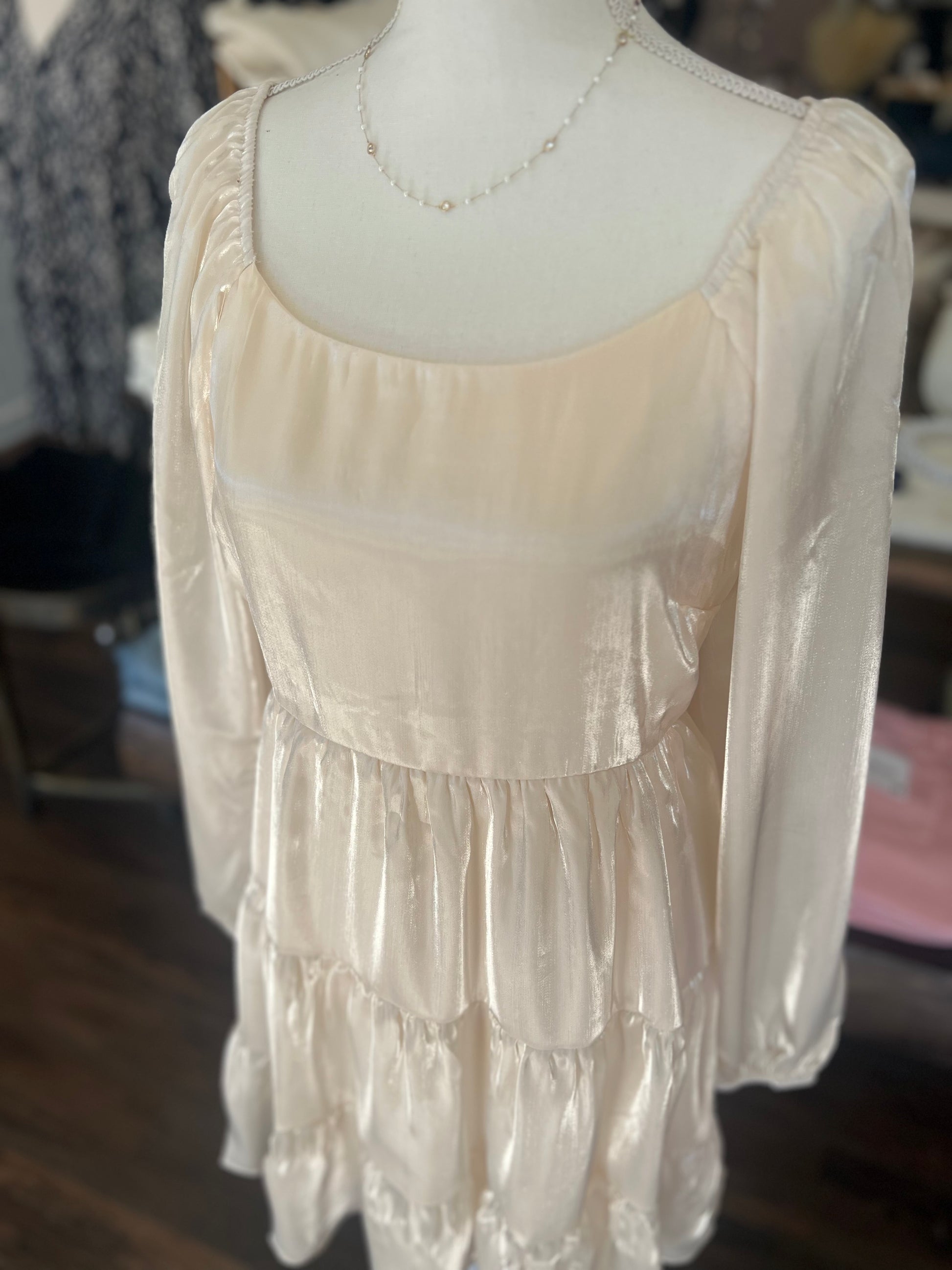 Elevate your wardrobe with the long sleeve dress, featuring a stunning shimmery finish and elegant tiered design. This long sleeve piece effortlessly blends sophistication with a touch of glamour, making it perfect for any occasion. Embrace your inner confidence and shine brightly wherever you go!