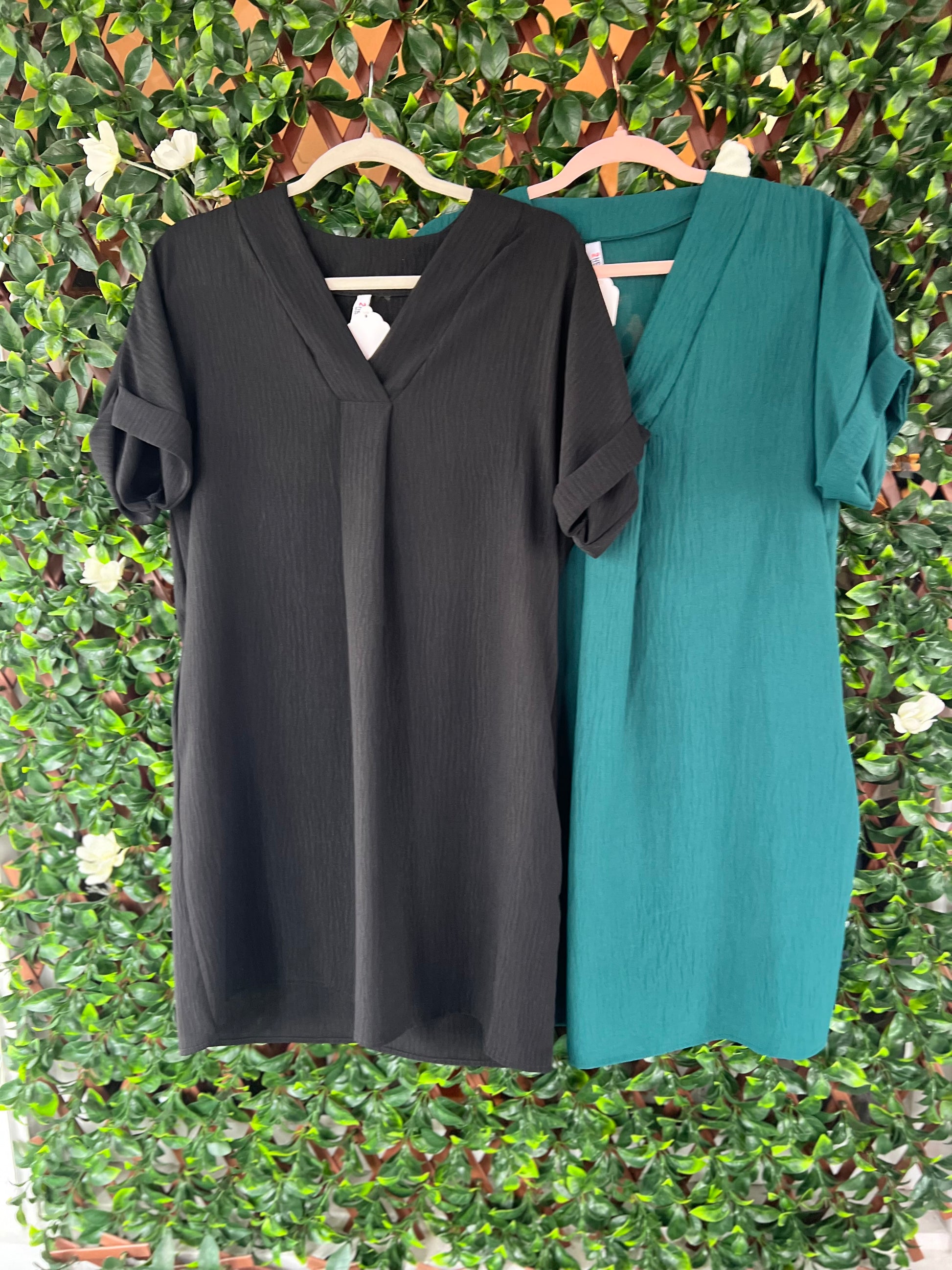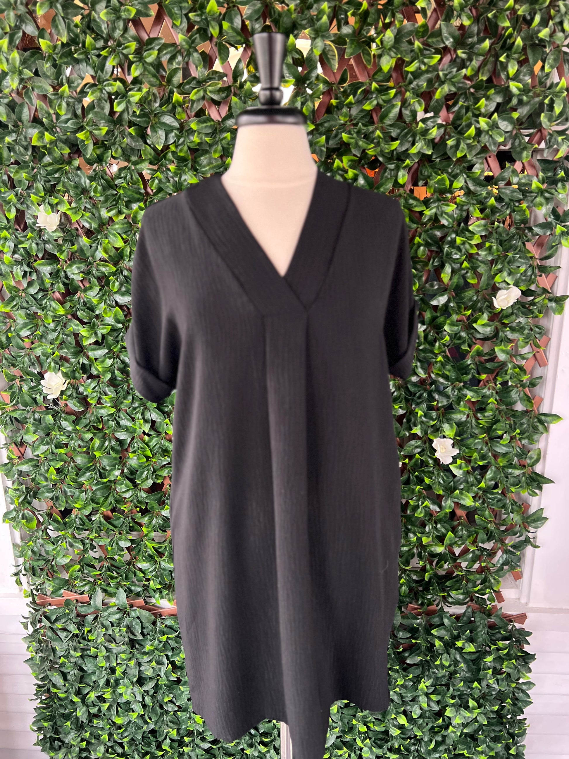 Experience the elegance of the Black V-Neck Airflow Dress! Its flattering v-neck and knee-length design create a stunning silhouette, while the cuff sleeves add a touch of sophistication. Crafted with breathable airflow fabric, this dress keeps you comfortable and chic, perfect for any occasion! Embrace your style!