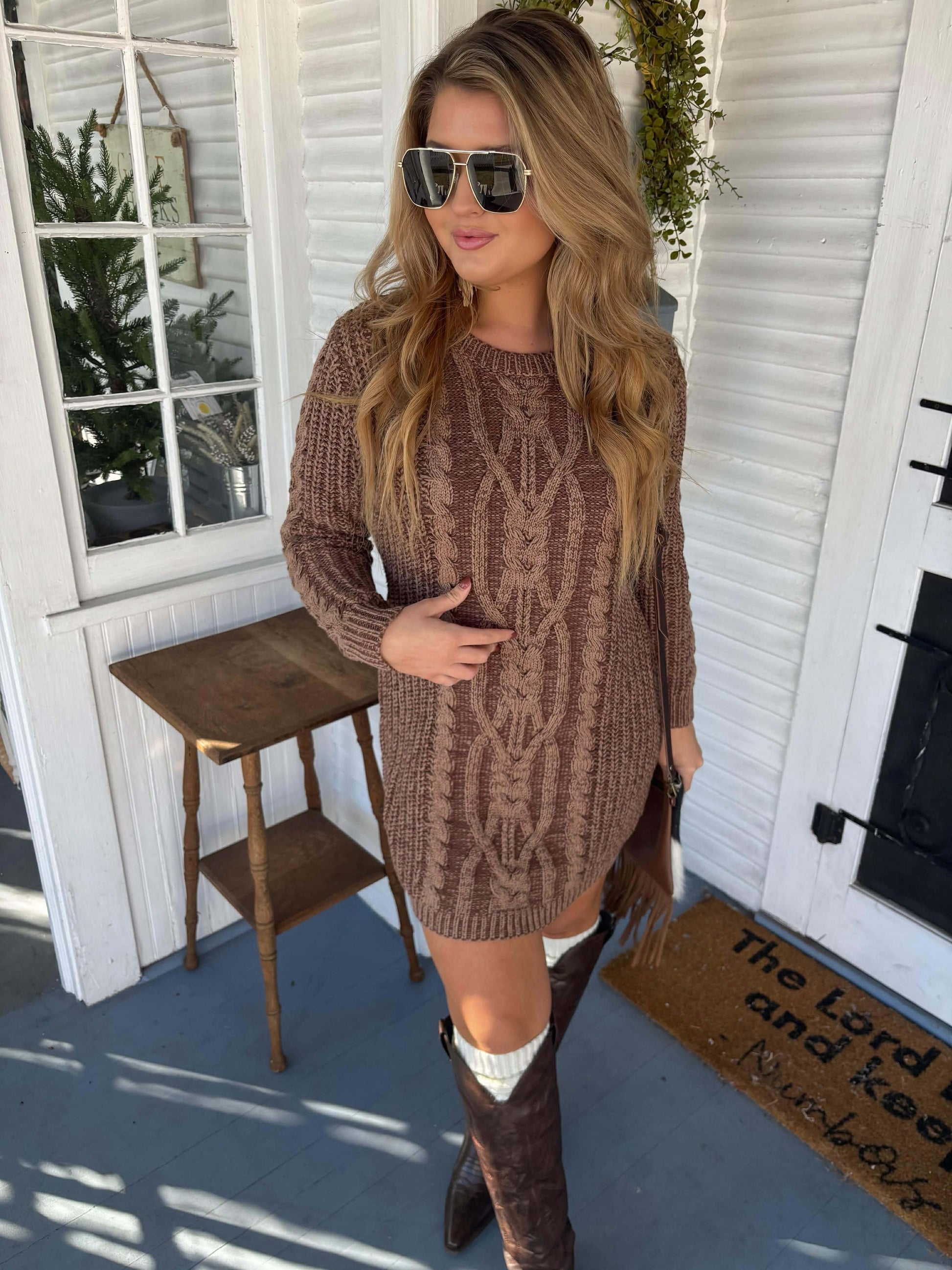 The Brown Sweater Dress features a cable knit design, providing thermal insulation and comfort during colder months. Its long sleeves enhance warmth while offering a chic aesthetic suitable for various occasions. The fabric composition ensures durability and ease of care, making it a practical addition to any wardrobe.