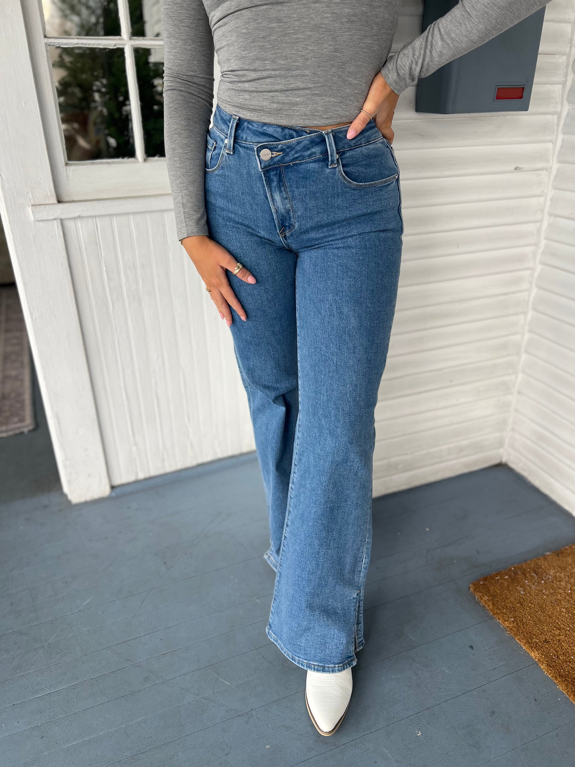 Mid Rise Cross Over Side Slit Straight Jeans