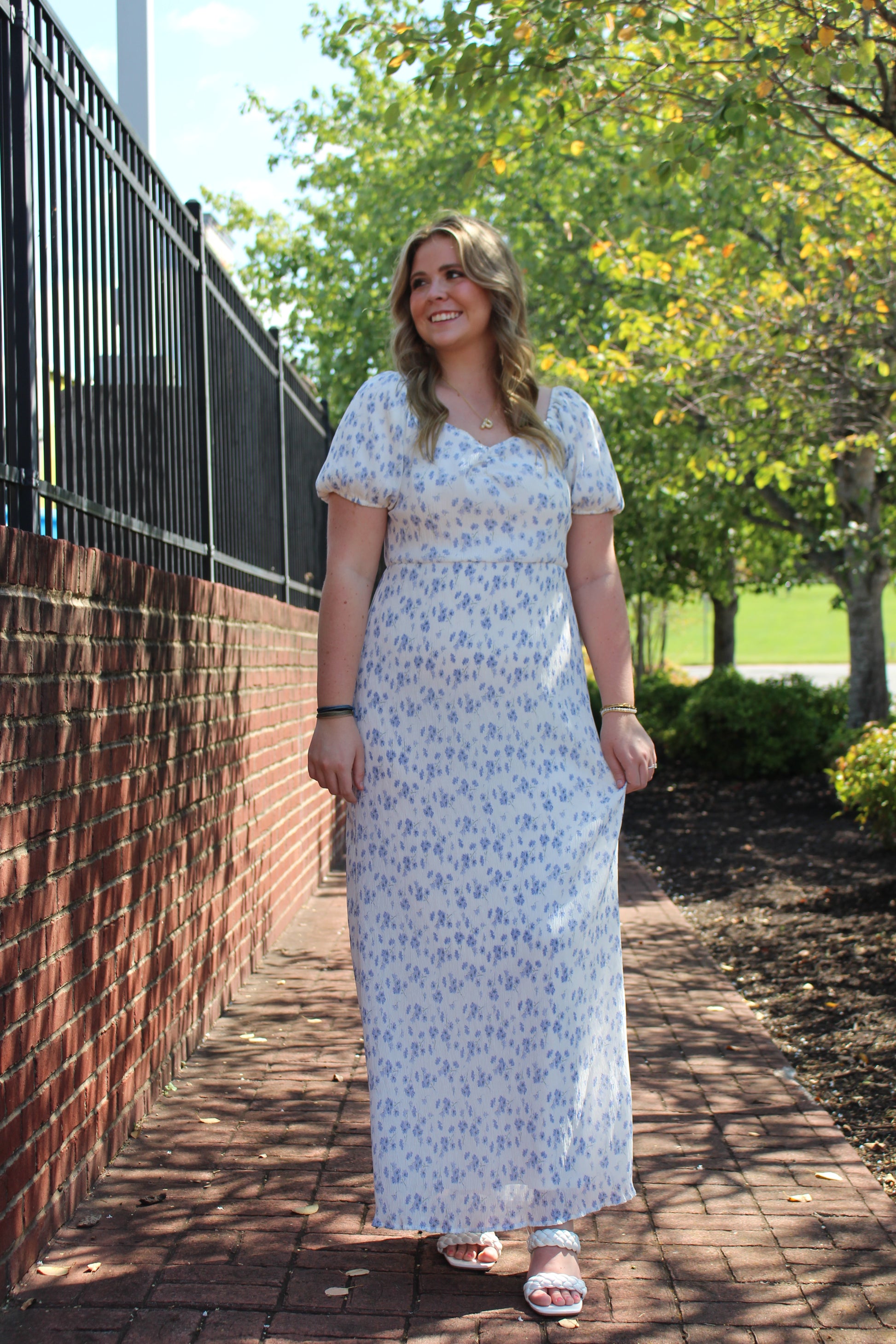 Experience the beauty of nature in this White/Blue Floral Dress. Made from textured material, this maxi dress boasts a delicate white and blue floral pattern, elevated by puffy sleeves for a touch of elegance. An artful choice for any occasion, this dress will make you feel like a blooming flower.